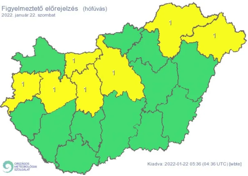 Nyolc megyére adtak ki riasztást hófúvás és havazás miatt szombatra – írja az Országos Meteorológiai Szolgálat.