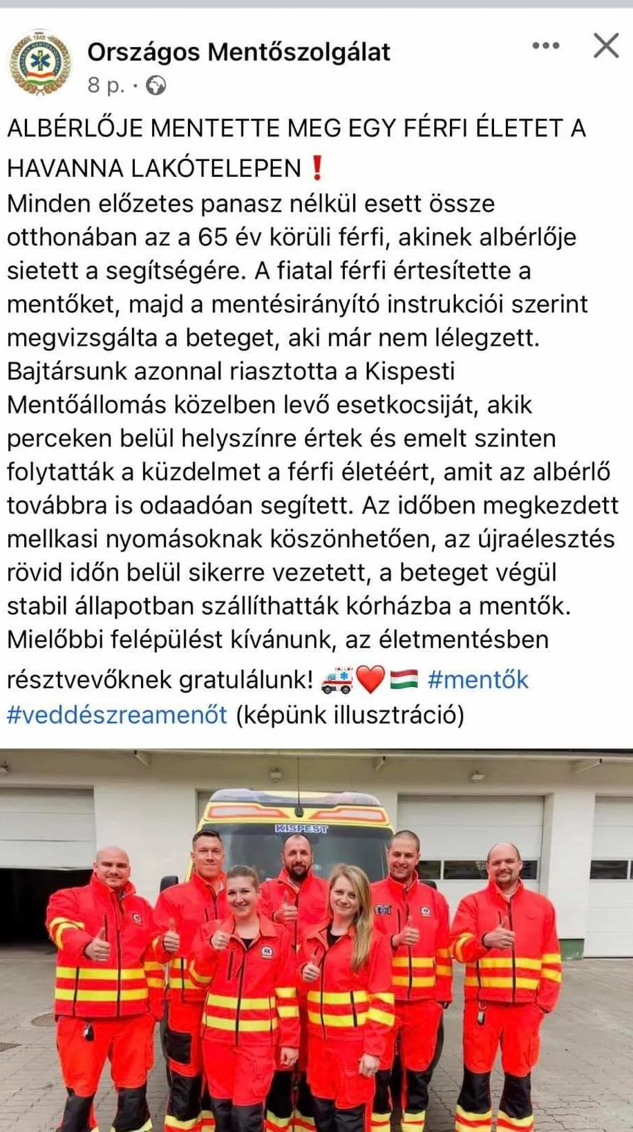 Az időben megkezdett mellkasi nyomásoknak köszönhetően, az újraélesztés rövid időn belül sikerre vezetett, a beteget végül stabil állapotban szállíthatták kórházba.