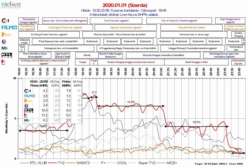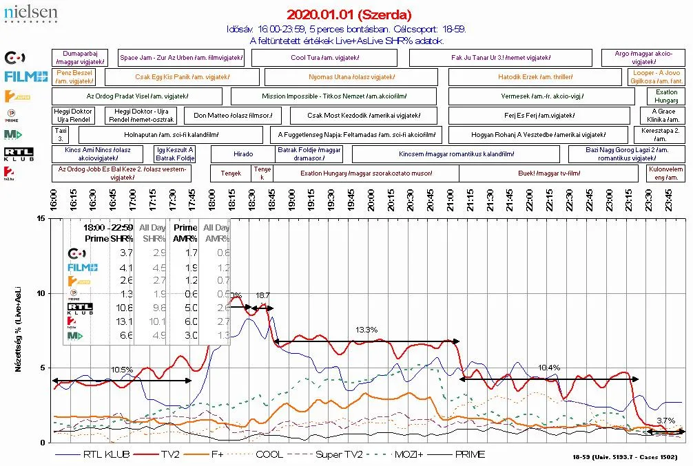 A nézettségi görbékből jól látszik, hogy az RTL új sorozata nem tudta ott tartani a nézőit. A TV2 mindkét korcsoportban, mind főműsoridőben, mind a teljes napon győzelemmel zárta a január elsejét. Az Exatlon Hungary vadonatúj pályákkal és még izgalmasabb versenyekkel jelentkezik minden hétköznap este a Mintaapák után.
