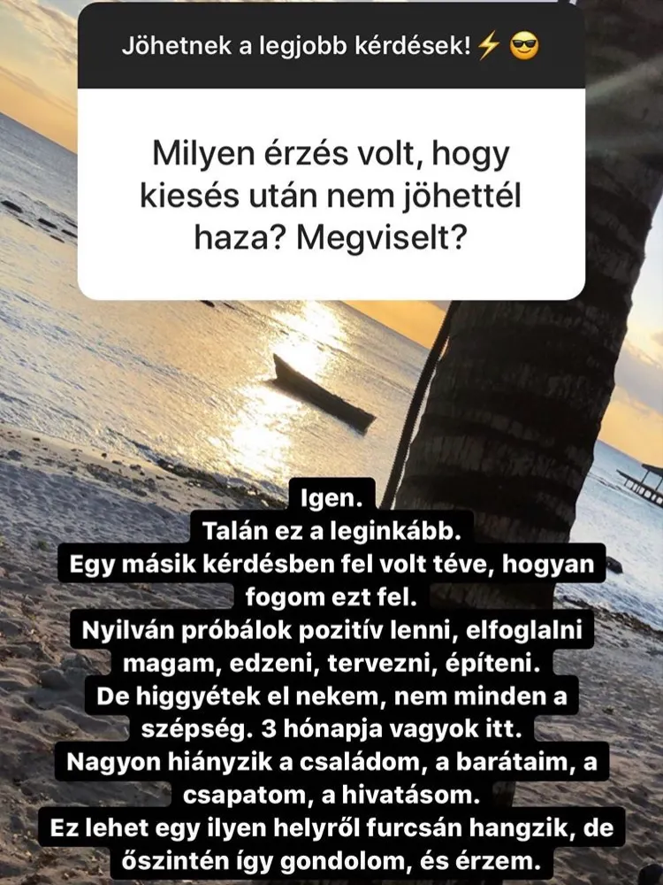 „Próbálok pozitív lenni, elfoglalni magam, edzeni, tervezni, építeni. De higgyétek el nekem, nem minden a szépség. Három hónapja vagyok itt. Nagyon hiányzik a családom, a barátaim, a csapatom, a hivatásom. Ez lehet, hogy egy ilyen helyről furcsán hangzik, de őszintén így gondolom és érzem” – fogalmazott az egykori Kihívó.