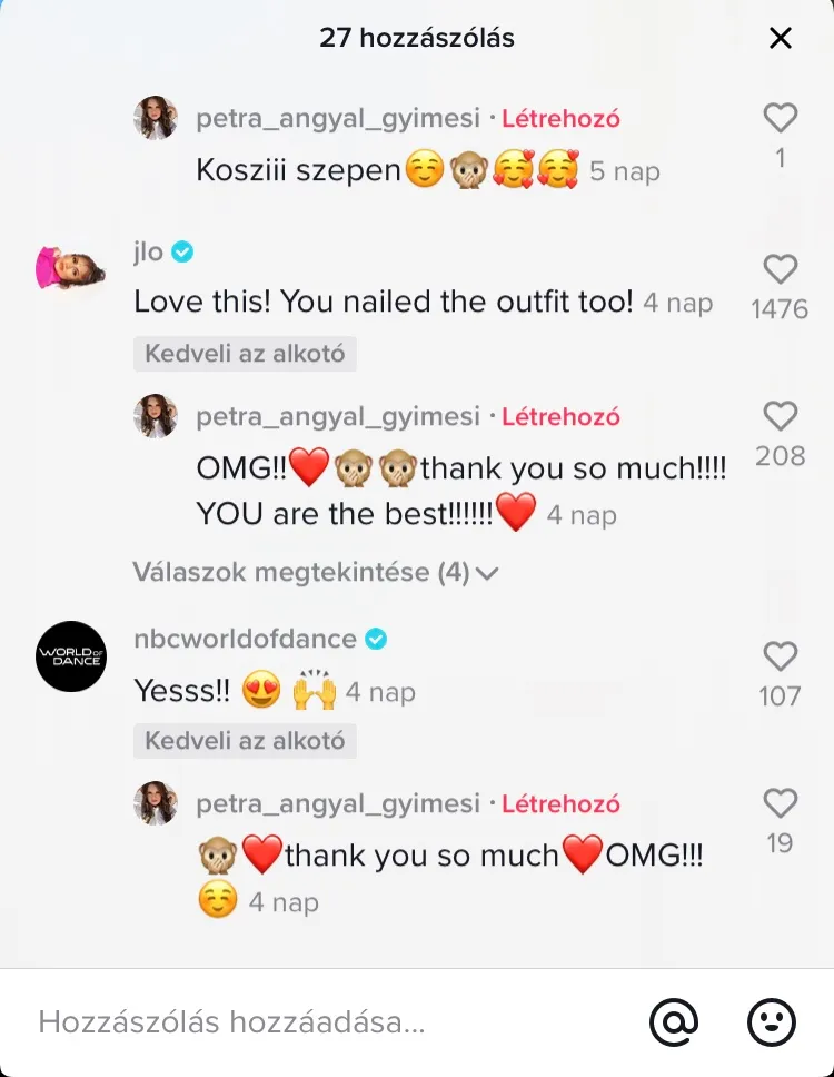 „TikTokon nagyon népszerűek az úgynevezett tánc kihívások. Jennifer Lopez is indított egyet a World of Dance kapcsán, mivel most debütált a show legújabb évada. Természetesen követem az oldalát, így 3 órára rá, hogy kitette, én is feltöltöttem a duettet, ami aztán több száz videóból ott is maradt elől, a 8. helyen! Így láthatta meg ő is a videóm, és lájkolta, majd hozzá is szólt! ” – árulta el lapunknak Petra, aki alig hitte el, hogy egy világsztár üzent neki.