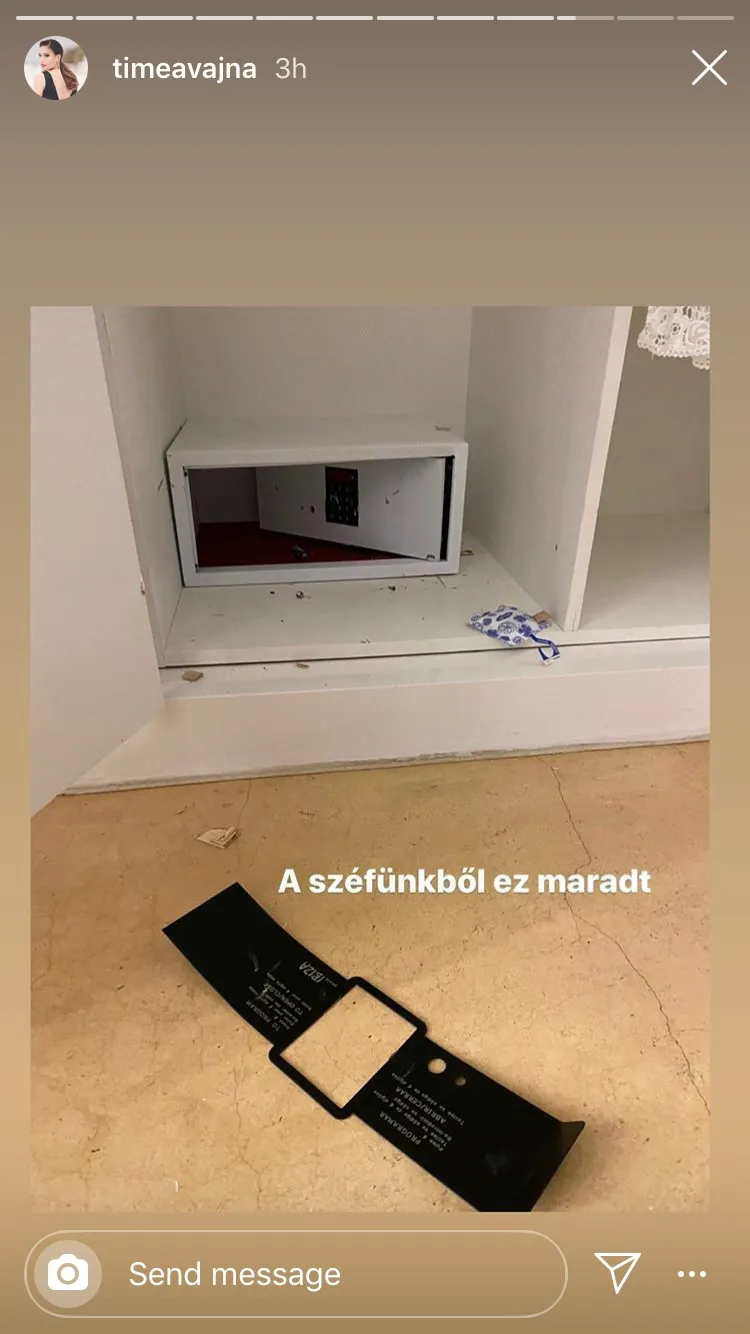 Vajna Timi Instagram sztorikban osztotta meg, hogy egy rabló brutálisan feltörte széfjüket. „Aki külföldre megy, fokozottan ügyeljen az értékeire, mert COVID alatt megnövekedett a betörések száma, és a rendőrség nem jön ki helyszínelni” – írta Timi, aki fotót is megosztott arról, ami széfjükből maradt.
