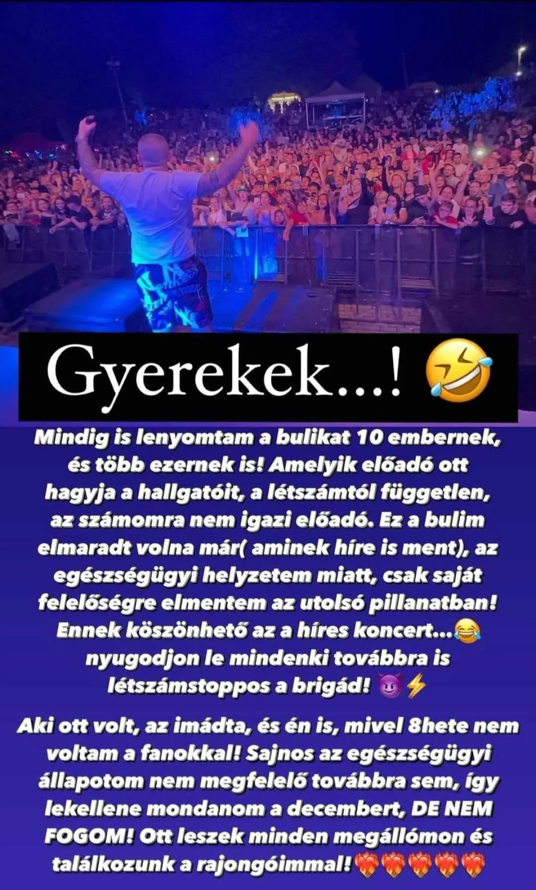 „Gyerekek! Mindig is lenyomtam a bulikat 10 embernek és több ezernek is! Amelyik előadó otthagyja a hallgatóit, a létszámtól független, az számomra nem igazi előadó. Ez a bulim elmaradt volna már (aminek híre is ment) az egészségügyi helyzetem miatt, csak saját felelősségre elmentem az utolsó pillanatban. Ennek köszönhető az a híres koncert. Nyugodjon le mindenki, továbbra is létszámstopos a brigád”