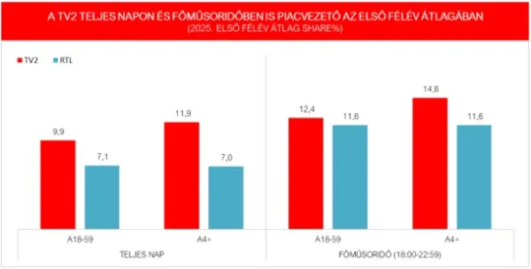 A TV2 a saját gyártású műsorok sikerének köszönhetően nem csupán június havi átlagban, hanem 2025 első félévében is piacvezető teljes napon és főműsoridőben egyaránt, a 18-59 éves nézők és a teljes lakosság körében is.