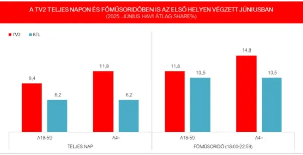 Júniusban ismét a TV2 nyerte a nézettségi versenyt, ennek köszönhetően 2025 első félévének átlagában a TV2 lett Magyarország piacvezető csatornája a fő kereskedelmi korcsoportban (A18-59) és a teljes lakosság (A4+) körében is, teljes napon és főműsoridőben egyaránt. A csatornacsaládok versenyében pedig szintén a TV2 Csoport áll az első helyen, mivel júniusban és első féléves átlagban is a TV2 Csoport csatornáit választotta a legtöbb néző mindkét kiemelt korcsoportban.