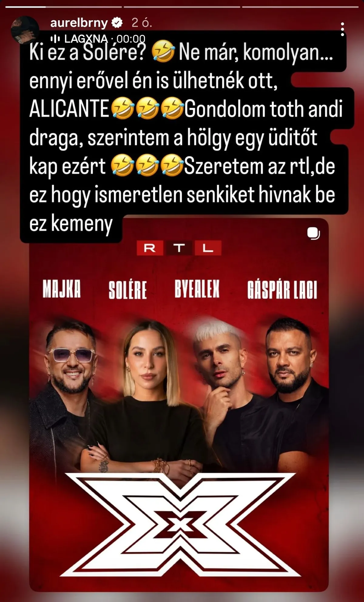 Nemrég jelentették be, kik lesznek a korábban többször megbukó X-Faktor mentorai idén. A régi motoros Gáspár Laci mellett visszatér ByeAlex és Majka is, a női frontot pedig Solére erősíti. Az énekesnőnek ugyan megvan a stabil rajongóbázisa, mégis akadnak, akik nem ismerik a munkásságát. Közéjük tartozik Bárány Aurél is.