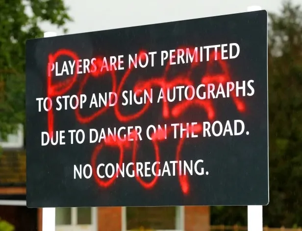 A felszólítást piros festékkel fújták fel egy fekete táblára, amely egyébként a szurkolókat figyelmezteti, hogy ne álljanak meg az út mellett aláírást kérni a közlekedési veszélyek miatt.