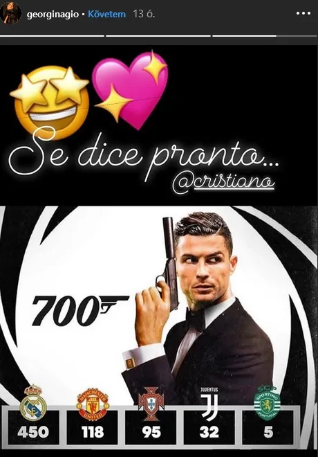 Ronaldo barátnője, Georgina Rodriguez az Instagramon 700-ra módosította a híres 007-es logót, vagy James Bondként, 007-es ügynökként ábrázolta szerelmét.