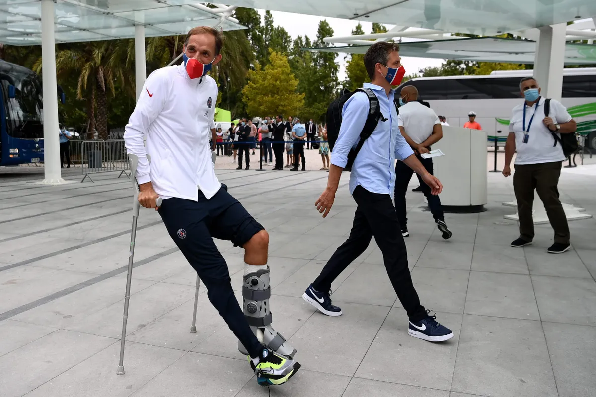 Mankóval, maszkban és járógéppel a bal lábán jelent meg kedden Thomas Tuchel Lisszabonban. A Paris Saint-Germain vezetőedzője sérülten is részt vesz az Atalanta elleni, esti, labdarúgó Bajnokok Ligája negyeddöntőn.
