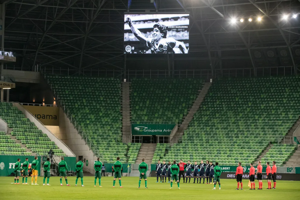 A Ferencváros-MTK NB I-es örökrangadó kezdése előtt is gyászszünetet tartottak a világbajnok argentin legenda tiszteletére, a fényképe pedig a kivetítőn volt látható.