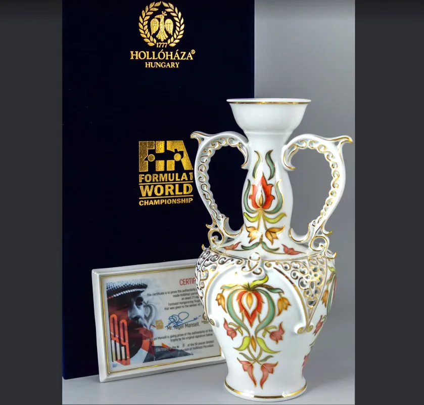 Az 1989-ben rendezett Formula-1 Magyar Nagydíját Nigel Mansell nyerte meg 25 másodperces előnnyel a legendás Ayrton Senna előtt. Akkor a győztesnek járó trófeát a Hollóházi Porcelánmanufaktúra készítette el, kifejezetten a nyertesnek formázva. Egy évvel ezelőtt a manufaktúra úgy döntött, néhány példányban kiadják a replikáját és megkérték Nigel Mansellt, hogy a certifikátot lássa el saját kézjegyével. Az akció sikerrel járt, a Forma-1-es világbajnok versenyző minden legyártott darabhoz kiállított egy saját kézzel aláírt igazolást arról, hogy a váza megegyezik az általa elnyert díjjal.