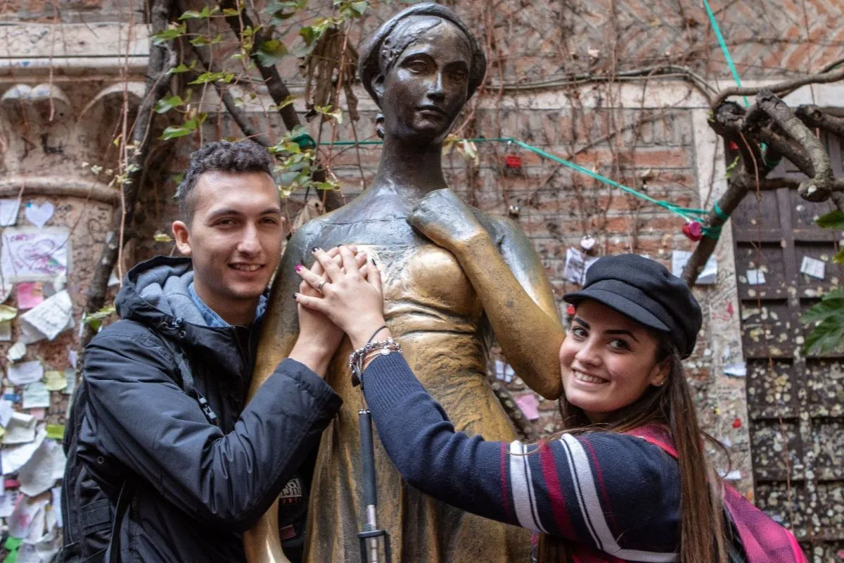 Shakespeare Rómeó és Júliájának köszönhetően az olaszországi Verona régóta a szerelmesek egyik legkedveltebb úti célja, amelyet évente másfél millióan keresnek fel abban a reményben, hogy szerelmük örökké tart majd, vagy ha eddig nem talált rájuk, majd ez az út meghozza a csodát. Nem csoda, hogy az ottani Júlia-ház szobra is ennek a szenvedélynek esett áldozatául: mivel a hősnő a bal mellét félig eltakarja, a jobb lett a turisták fő célpontja, ami nem bírta tovább a rohamot: a sok simogatástól úgy elvékonyodott az anyag, hogy végül kilyukadt - adta hírül az ANSA.