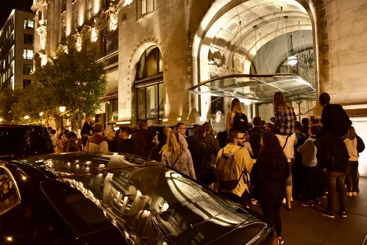 Hatalmas a tömeg már a téren, de sok rajongó a Four Seasons Hotel előtt várja, hogy fotózkodhasson a színész-énekessel.