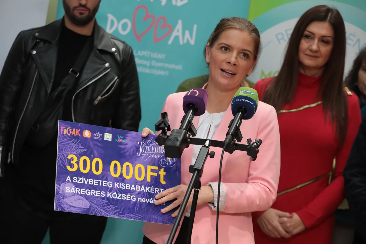 A sajtótájékoztatón részt vett Albertné Tiringer Mária, Sáregres Község Polgármestere, aki községe tagjaival 300 ezer forintot gyűjtött a szívbeteg kisbabák számára.