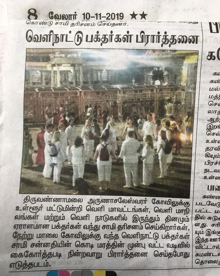 „Ez aztán az üdvözlés! Tegnap éjjel 2-kor érzetünk, és ma már benne van a csoportunk egy része a mai újságban. Ha kinagyítjátok a képet, láthatjátok a nagy szőke búrámat, amivel nem tudnak betelni a helyiek. Itt épp Tamil Nadu legnagyobb Síva komplexumában meditálok, mantrázok a csoportunk egy részével”