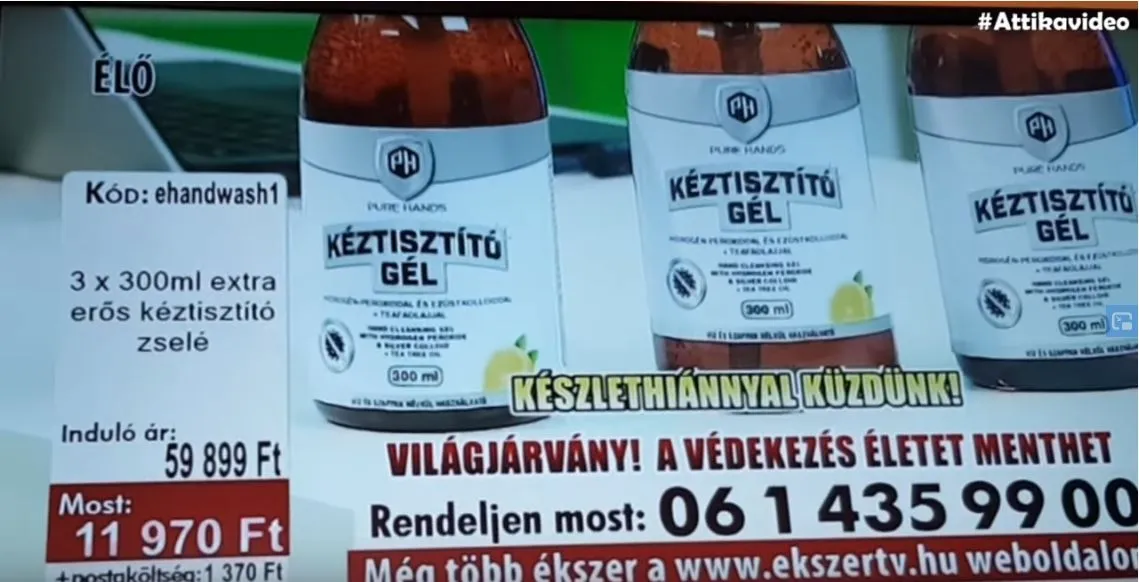 Elképesztő felháborodást váltott ki az Ékszer TV vasárnapi adása, amelyben alig egy liter kézfertőtlenítő szerért (3 db 3 dl-es) a műsor első felében 59 899 forintot kért a tévés kikiáltó. Az internetre kikerült adásban a műsorvezető drámai felvezetővel kezdi árulni a portékát, egyenesen „történelmi pillanatnak” nevezni, hogy 462 ember érdeklődik a kézfertőtlenítők iránt. Később, elcsukló hangon, nagy hatásszünetekkel közli:
