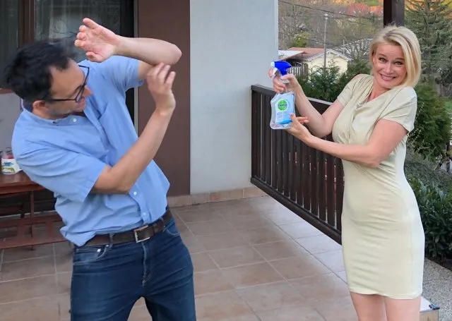 Zoltán Erika először meglepődött, amikor meglátta Robit közeledni a kézfertőtlenítős flakonnal, de végül jót nevetett az ötletes és persze biztonságos megoldáson.
