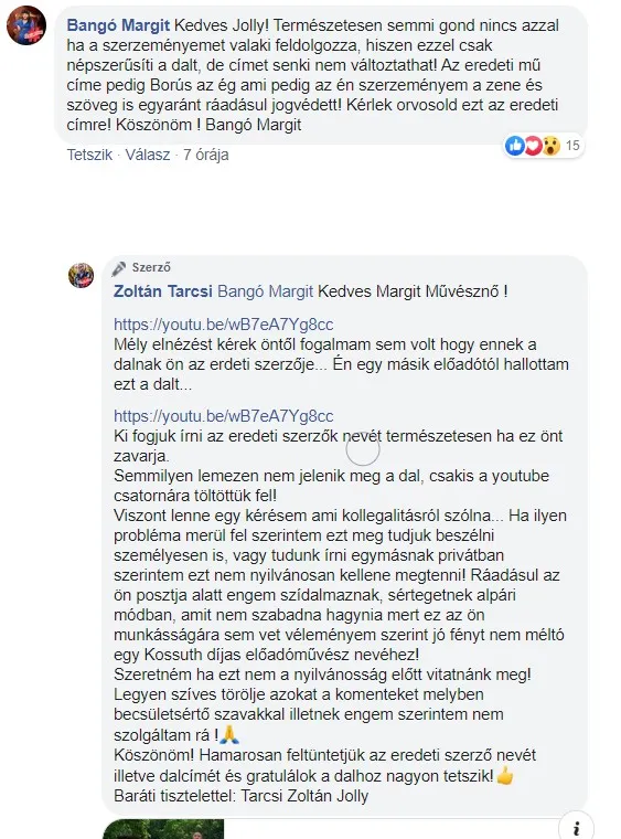 Eddig leginkább a magánéleti problémáit teregette ki rajongóinak, most pedig képtelen leállni, miután Bangó Margit jelezte felé, hogy a dalt, amit volt szíves feldolgozni, történetesen ő írta és annak jogaival is ő rendelkezik. Egyúttal kérte, hogy ha lehet, ne írja át a nóta címét...