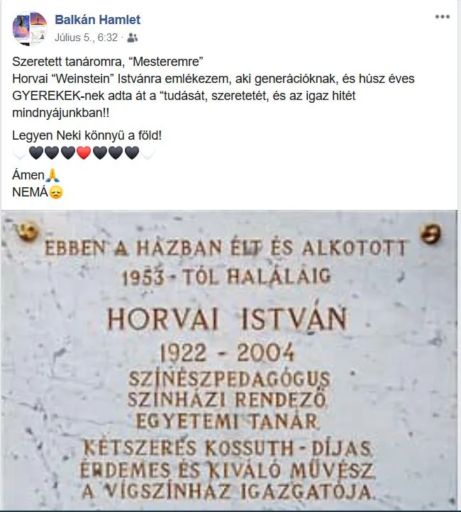 „Szeretett tanáromra, »mesteremre«, Horvai ‘Weinstein‚ Istvánra emlékezem, aki generációknak és húszéves gyerekeknek adta át a »tudását, szeretetét és az igaz hitét mindnyájunkban«! Legyen Neki könnyű a föld! Ámen! Nemá!” – írta aligha félreérthető stílusban Hujber Ferenc.