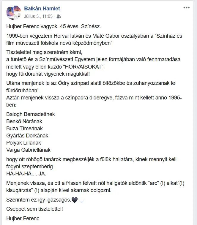 A Ripost most kiszúrta, hogy Hujber, Balkán Hamlet néven, egy friss Facebook-posztjában meséli el, hogyan alázták meg őt és társait a tanáraik annak idején. A színész egy konkrét esetet is felelevenít, melyben megszólítja azon osztálytársait is, akik most a változások ellen tiltakoznak. „Tisztelettel meg szeretném kérni a tüntető és a Színművészeti Egyetem jelen formájában való fennmaradása mellett vagy ellen küzdő »Horvaisokat«, hogy fürdőruhát vigyenek magukkal! Utána menjenek le az Ódry színpad alatti öltözőkbe és zuhanyozzanak le fürdőruhában! Aztán menjenek vissza a színpadra dideregve, fázva, mint kellett anno 1995-ben. Menjenek vissza, hogy az ott röhögő tanárok megbeszéljék a fülük hallatára, kinek mennyit kell fogyni szeptemberig. Menjenek vissza, és ott a frissen felvett női hallgatók eldöntik arc, alkat, kisugárzás alapján, kivel akarnak dolgozni. Szerintem ez így igazságos. Cseppet sem tisztelettel! Hujber Ferenc” – írta volt osztálytársainak. Később egy kommentre reagálva konkrétan leírta: szexuálisan és verbálisan is megalázták őt és osztálytársait.
