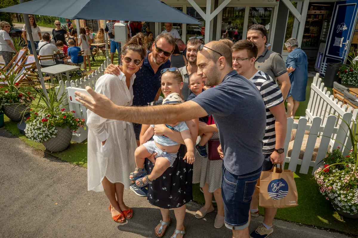képen: Ördög Nóra és Nánási Pál Nekem a Balaton elnevezésű kisboltja előtt szelfizik vásárlókkal
