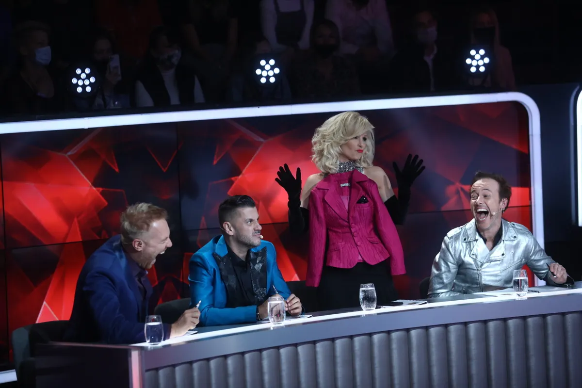A Sztárban Sztár zsűritagja alapvetően egy szexi gúnyát húzott, ami elé egy lila férfizakó került.