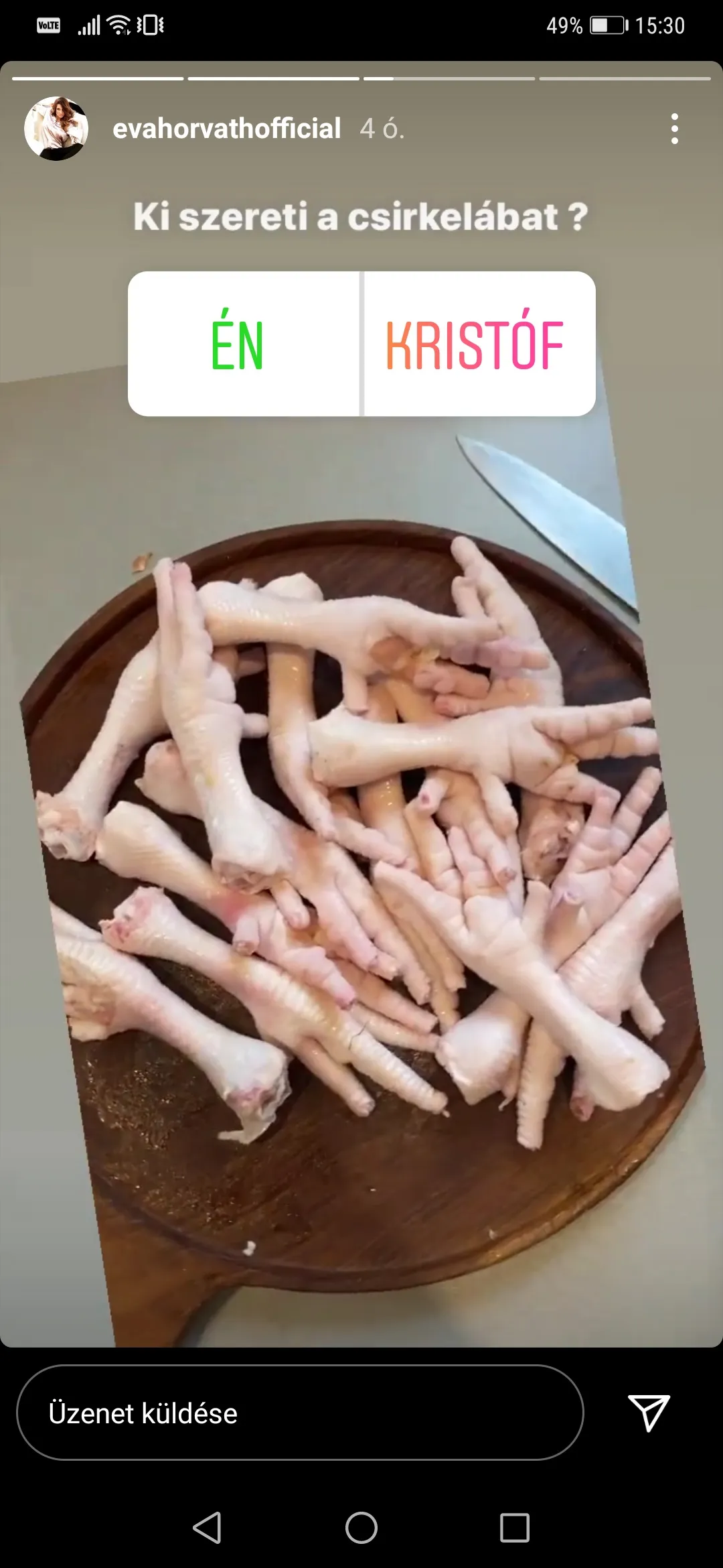 A csinos modell, Instagram-oldalán tudatta a követőivel, hogy épp Kristóf kedvenc ételét készíti, ami nem más, mint a csirkeláb pörkölt. A fotó alapján nem kisadag készült, de meglehet, hogy levesbe is kerül majd egy, két láb.