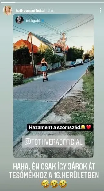 Tóth Gabi egy lesifotót készített Veráról, amint csutkagázon elporol tőle a babalátogatás után. Az idősebbik Tóth lány nem az autójának lépett oda, hiszen a rövid útra egy környezetbarát megoldást választott.