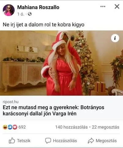 Varga Irén egy önérzetes teremtés, így kissé zokon vette, hogy legújabb klipjét nem ajánlottuk gyerekeknek. A rémületes blődliétől továbbra is óvnánk a kicsiket, mert kobrakígyók vagyunk...
