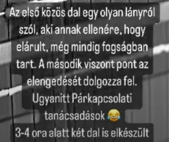 A második viszont pont az elengedését dolgozza fel. Ugyanitt párkapcsolati tanácsadások! - tette hozzá viccesen a zenész, a posztja azonban inkább tűnik szomorúnak, mint vidámnak.