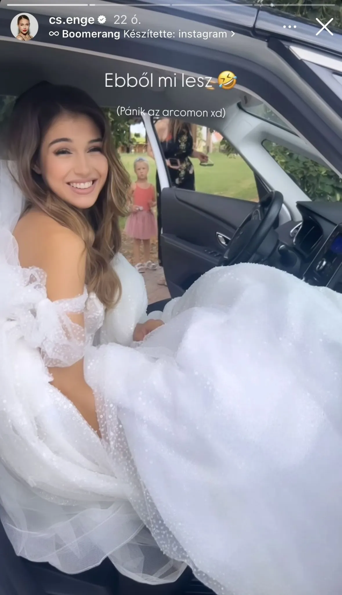„Tatjanával lőttünk egy gyors képet két helyszín között” – írta a képhez Csenge, aki annak ellenére, hogy mennyire csodásan mutatott az esküvői ruhában, mégis egyfajta pánikot emlegetett kiülni az arcára.