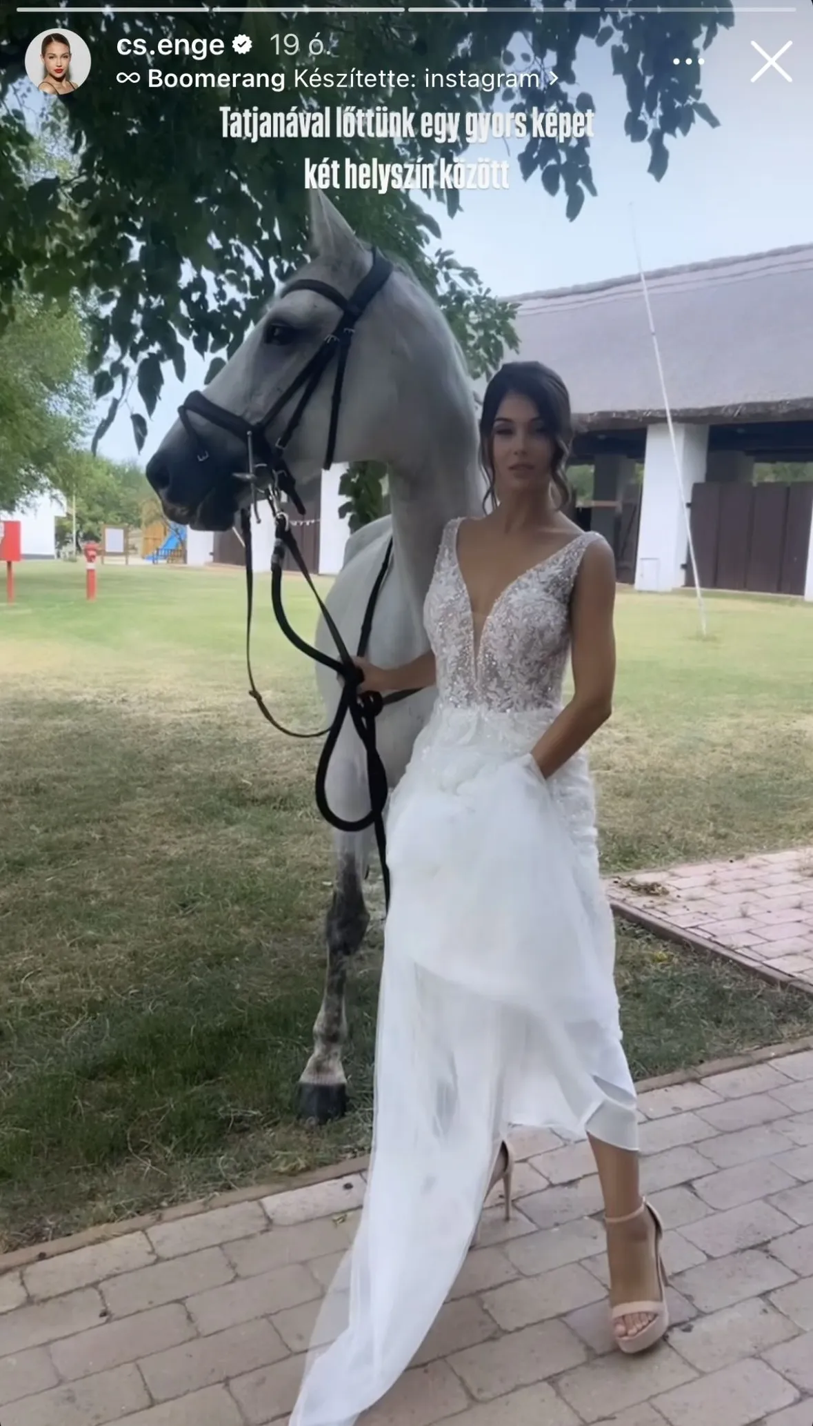 Csenge magára aggatta a gyönyörű esküvői ruhát, minden bizonnyal egy fotózás miatt, véletlenül sem azért, hogy elköteleződjön egy életen át, amire még sok ideje van. Ugyan a fehér paripa, amivel Csenge fotózkodott, nem éppen a rapper kiszemeltjét, KKevint hozta a hátán, sokkal inkább egy modell munkát, amit persze a modellkedéssel is foglalkozó celebritás szívesen vállalt. Mintha csak egy álom esküvőn kapták volna lencsevégre modellt a fehér paripával: