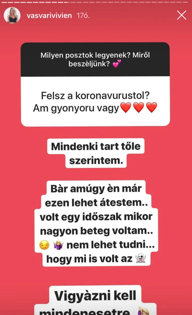 „Mindenki tart tőle, szerintem. Bár amúgy én már ezen lehet, hogy átestem. Volt egy időszak, mikor nagyon beteg voltam. Nem lehet tudni, hogy mi is volt az. Vigyázni kell mindenesetre!” – fogalmazott Vasvári, akinek a bejegyzéséből az is kiderült, hogy gyermekeire most az édesanyja vigyáz, mivel a munkáltatója két hónapos szabadságra küldte őt. Így, ha nincs otthon Vivien a munkája miatt, tudja, hogy gyermekei jó kezekben vannak. Követői szerint azonban ez nem felelős magatartás a sztáranyukától, hiszen a kialakult helyzetben otthon kellene maradnia, ahogyan ezt a szakemberek is tanácsolják.
