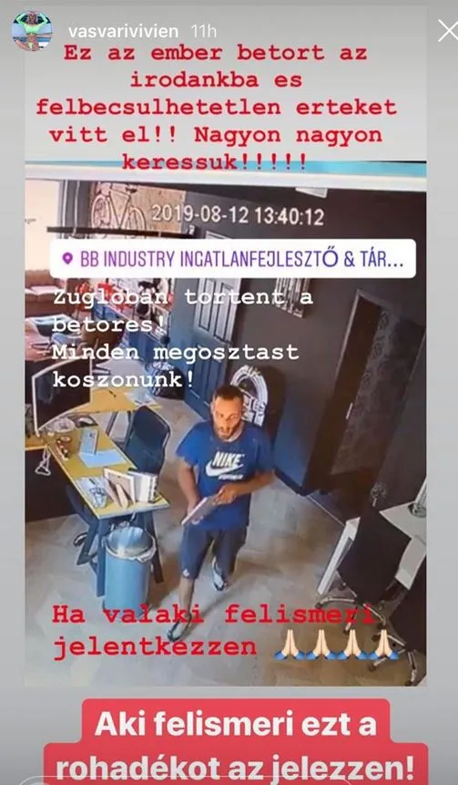 Kirabolták a magyar luxusfeleséget, teljesen kiborult Vasvári Vivien . Ám a biztonsági kamera mindent vett, így a férfi tökéletesen kivehető a felvételen.