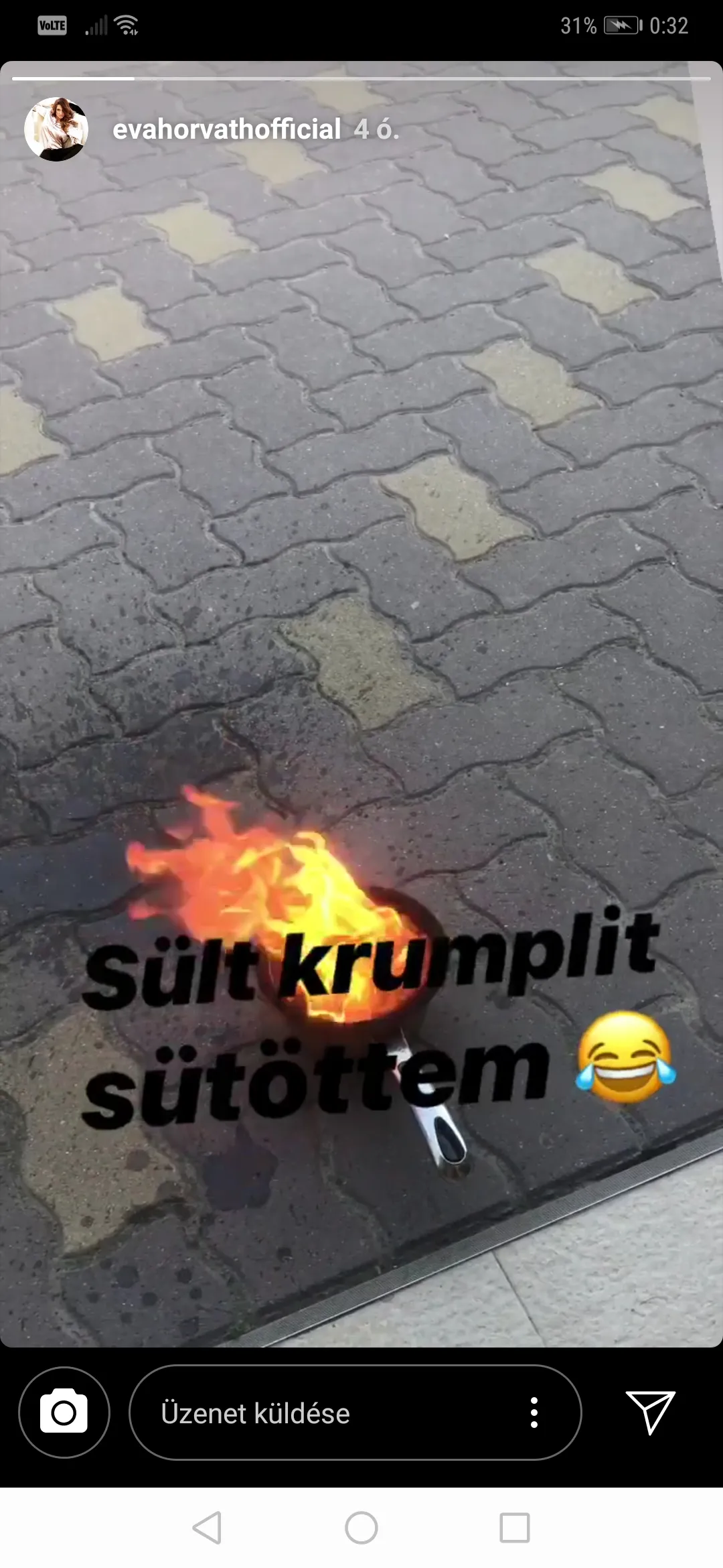 A hétvégén azonban csak többszöri nekifutásra került a ropogós sült krumpli az étkezőasztalra. Valami elvonhatta Éva figyelmét... A serpenyőben túlmelegedett az olaj, és egy szempillantás alatt hatalmas lángos csaptak fel a konyhájában. Szerencsére az anyuka nem esett pánikba, gyorsan reagált, a lángoló edényt azonnal kivitte a ház elé az udvarra. A szerencsétlen esetről Éva Instagram–oldalán is posztolt. A képen látható tűzcsóvákat elnézve, akár nagyobb tragédia is történhetett volna.„Sült krumplit sütöttem, mit szóltok hozzá” – tette fel a költői kérdést viccesen Horváth Éva, aki mostantól bizonyára jobban figyel majd a konyhában.