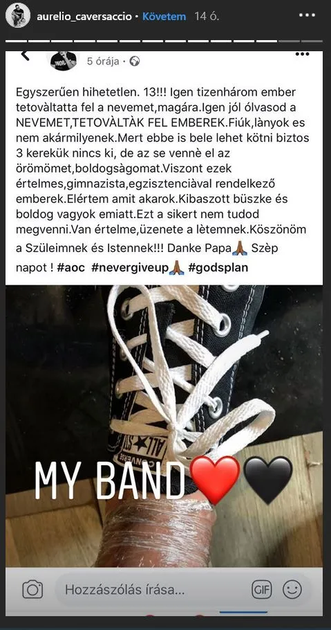 „Egyszerűen hihetetlen! Tizenhárom! Igen, tizenhárom ember tetováltatta fel a nevemet magára. Igen, jól olvasod. Fiúk, lányok és nem akármilyenek. Ebbe is bele lehet kötni, hogy biztosan nincs ki a három kerekük, de az se venné el az örömömet, boldogságomat. Ezek értelmes, egzisztenciával rendelkező emberek. Elértem, amit akarok. K*baszott büszke és boldog vagyok. Ezt a sikert nem tudod megvenni” – írta bejegyzésében Aurelio, aki nem csoda, hogy úszik a boldogságban. Nemrég még azt is elérte, hogy megbocsásson neki a menyasszonya, Dominika, aki még augusztus elején bizalmatlansági okokra hivatkozva dobta ki nagyszájú vőlegényét.