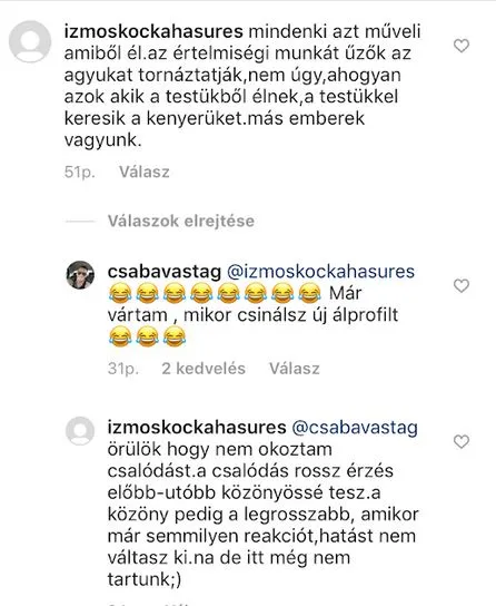 „Mindenki azt műveli, amiből él. Az értelmiségi munkát űzők az agyukat tornáztatják, nem úgy, ahogyan azok, akik a testükből élnek” – írta le a zaklató, akinek nem kellett sokat várni a válaszra sem, sikerült elérnie, hogy felhívja magára Csaba figyelmét.