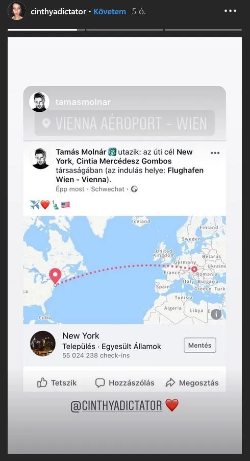 Az énekes egy nyolcnapos amerikai utazást ajándékozott a fotóművésznek, amivel egyik legnagyobb álmát váltotta valóra. Cinthya ugyanis még nem járt Amerikában. A szerelmespár összecsomagolt, és hétfőn el is indult a tengerentúlra. De a reptéren még gyorsan lőttek néhány szelfit, amit fel is töltöttek Instagram sztorijaikba.