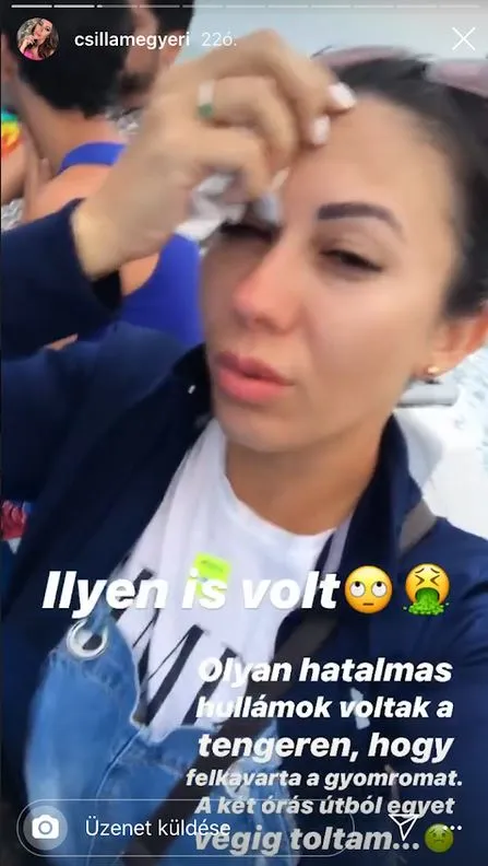 „Olyan hatalmas hullámok voltak a tengeren, hogy felkavarta a gyomromat. A két órás útból egyet végigtoltam” – írta le Csilla, aki fotót is csatolt. Látszik is rajta, mennyire megviselte őt az út.