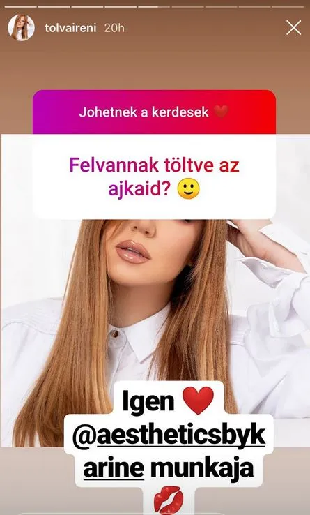 Szépészeti beavatkozást végeztek el a szakemberek Tolvai Renin! Az Instagram-oldalán, egy rajongói kérdéssel kapcsolatban árulta el, hogy nemrégibenfeltöltette a száját.