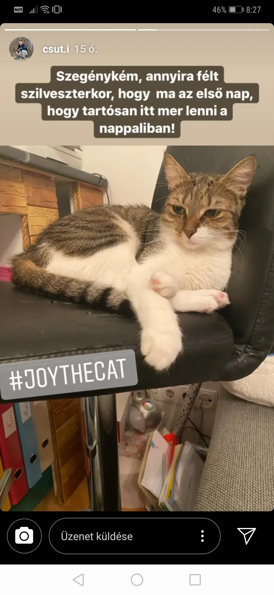 Ha ez nem lenne elég, a házi kedvencük is gyengélkedik. A kiscica annyira megijedt a szilveszteri zajoktól, hogy elmenekült a petárdadurrogások elől. A kisállat még most, napokkal később is csak bizalmatlanul marad egy helyben a család nappalijában. Erről Csuti számolt be az Instagram-oldalán.