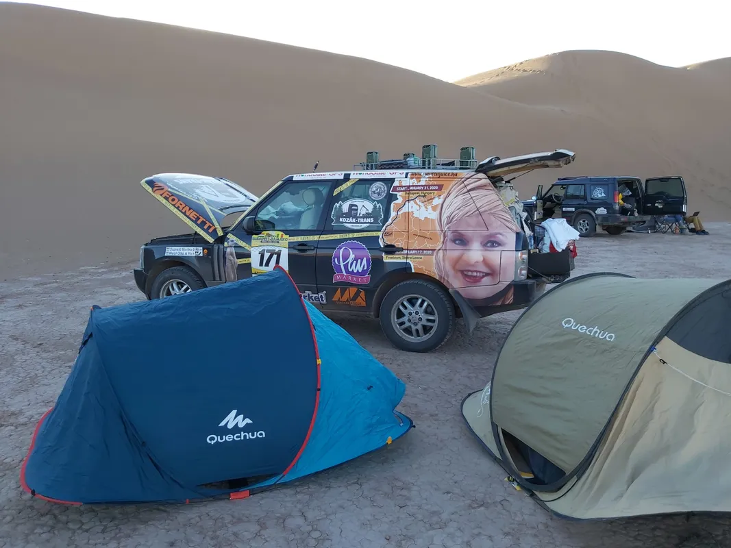 „Nemrég átjöttünk egy kősivatagon, ahol nem volt út, csak mentünk, amerre a gondolat vitt bennünket. Beértünk egy táborba, ahová összegyűlt az összes autós. Ott végre felállítottak néhány zuhanyzót és wc-t, igaz, a víz csak csurrant-cseppent belőle. Mondjuk, a sátrazáshoz sem vagyok hozzászokva, nem nagyon találtam a helyemet, forgott rajtam a hálózsák. Persze annyira nem volt rossz, de a napkeltét jobban élveztem. A kősivatagon keresztül haladva egy oázisba jutottunk csupán koordináták alapján, amit homokdűnék vettek körbe. Napfelkelte előtt mindenki felmászott rájuk, és mint a szurikáták vártuk a pirkadatot. Hihetetlen, életre szóló élmények érik itt az embert” – áradozott a művésznő, aki már egy kisebb balesetet is megélt a sivatagban.