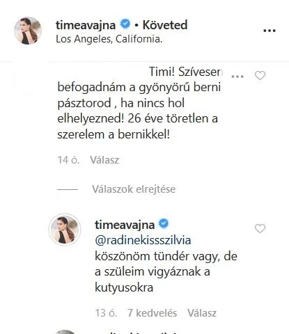 Tímea ugyanis csak a két macskáját, Chanelt és Szimbát vitte magával a tengerentúlra. Most egy instagramos bejegyzésből derült ki, hogy az özvegy felelősségteljesen gondoskodott elhunyt férje kedvenceiről. Jelentkezett ugyanis egy rajongó, aki azt írta, szívesen örökbe fogadná az egyik kutyust. Tímea megköszönte a felajánlást, de nyomban visszautasította azt, majd hozzátette, hogy a berni pásztor fajtájú négylábú, Rocky, az adoptált eb, Mushu és a rózsás kakadu, Tati is jó kezekben lesz a jövőben. Nemrég ugyanis Miskolcra, a szülői házba költöztette őket.