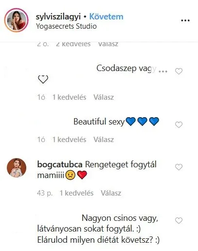 „Nagyon csinos vagy. Látványosan sokat fogytál. Elárulod, milyen diétát követsz?” – kérdezte egy másik követője.