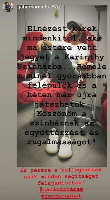 „Elnézést kérek mindenkitől, aki ma estére vett jegyet a Karinthy Színházba. Remélem, minél gyorsabban felépülök, és a héten már újra játszhatok. Köszönöm a színháznak az együttérzést és a rugalmasságot. És persze a kollégáimnak, akik minden segítséget felajánlottak” – közölte ismerőseivel és barátaival az Instagram-oldalán Baronits Gábor, aki egy kórházi fotót is csatolt bejegyzéséhez, amin jól látni, a színész infúzióra kötve, feszülten és fáradtan várja, hogy végre enyhüljenek a fájdalmai.