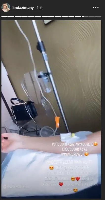 „Pörögjön az anyagcsere. Erősödjön az immunrendszer” – írta bejegyzésében Linda, aki úgy tűnik, jól bírja, ha megszúrják. Mosollyal az arcán, türelmesen várta ki, amíg lecsöpög az infúzió.