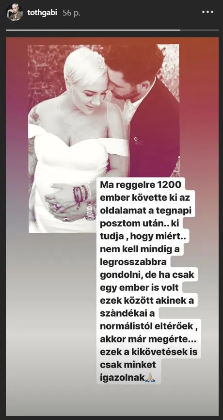 „Ma reggelre ezerkétszáz ember követte ki az oldalamat a tegnapi posztom után. Ki tudja, hogy miért? Nem kell mindig a legrosszabbra gondolni, de ha csak egy ember is volt ezek között, akinek a szándékai a normálistól eltérőek, akkor már megérte. Ezek a kikövetések is csak minket igazolnak” – tette közzé meglepődve Gabi.