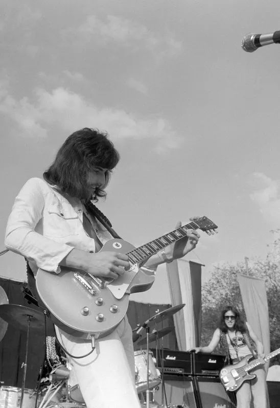 Barta Tamás gitározik az LGT együttes koncertjén a Gellért-hegyi szabadtéri színpadon, a háttérben Frenreisz Károly basszusgitáros.