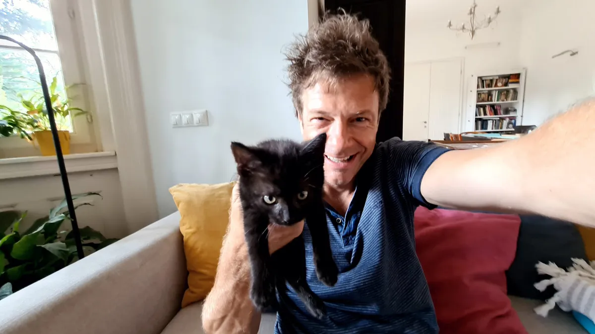 „A Balatonon nyaraltunk, és az egyik este valószínűleg bedobtak hozzánk egy kiscicát. Nagy volt a riadalom, mert arra ébredtem, a gyerekem szól, hogy egy félszemű, félhalott kiscica van a kertben. Kiderült, hogy nem félszemű, csak a csipától összeragadt a szeme. Félhalottnak félhalott volt, de hamar feltápláltuk és Pityu lett a neve. Én nem vagyok egy macskás alkat, de az első pillanattól kezdve imádom. Szeretem dögönyözni és jó látni, ahogy fejlődik. Nyávogni sem volt ereje az első napokban, mostanra meg már egy duci baba” – áradozott új barátjáról a műsorvezető, aki Pityut azonnal bemutatta kutyusának is.