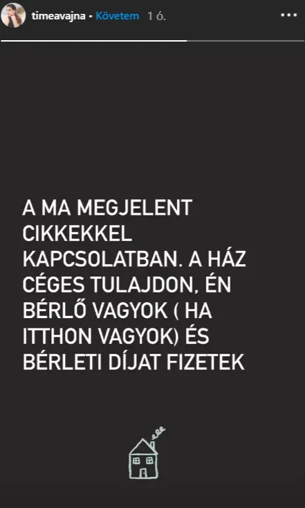 „A ma megjelent cikkel kapcsolatban. A ház céges tulajdon, én bérlő vagyok. Ha itthon vagyok. Bérleti díjat fizetek” - közölte szűkszavúan, mégis sokatmondóan Timi.